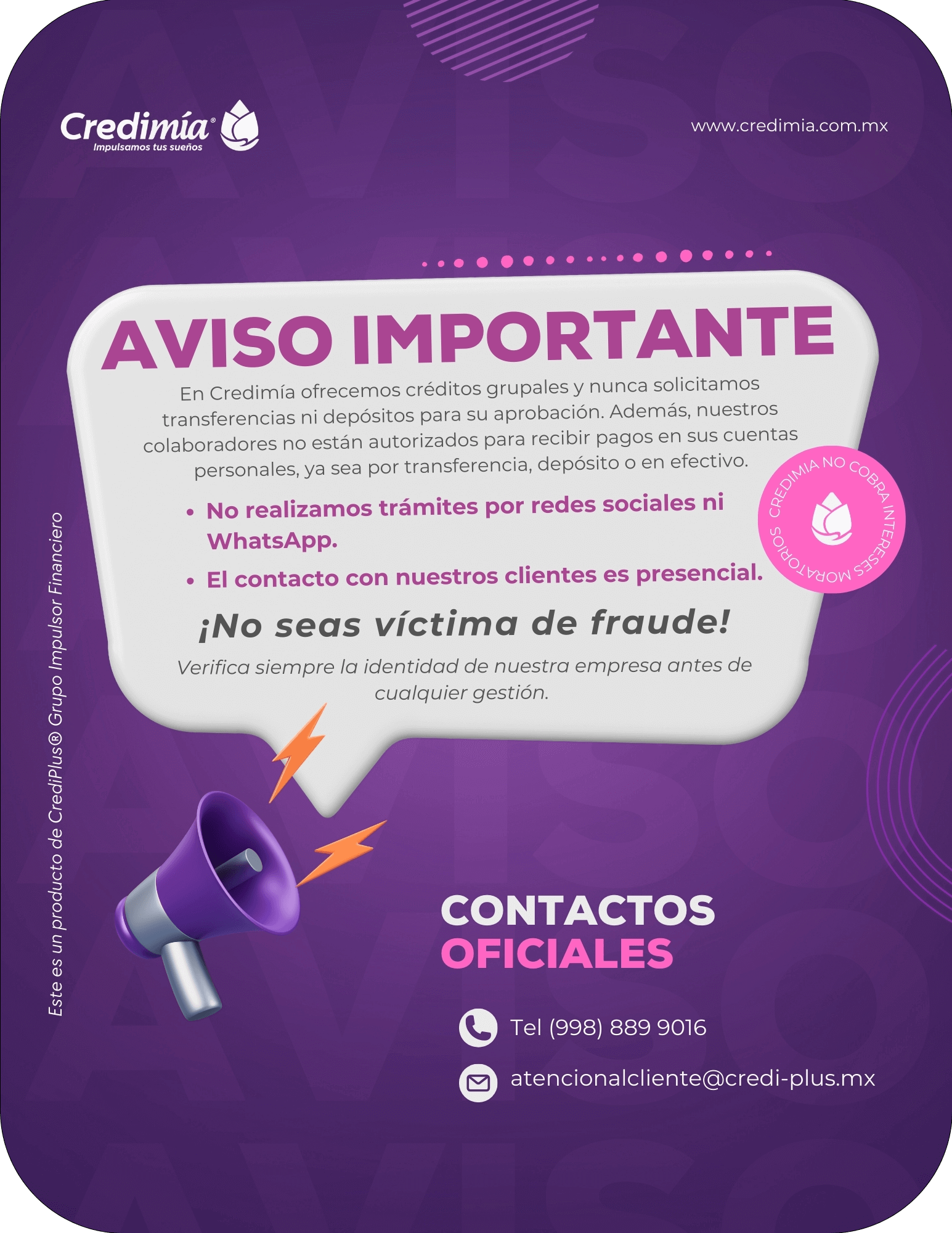 Nos enfocamos en que tu calidad de vida sea mejor. Credimía fue creado con el deseo de hacerte sentir más cercana. Trabajamos para ofrecerte soluciones responsables para aliviar tus necesidades financieras y te ayudamos a impulsar tus proyectos.
